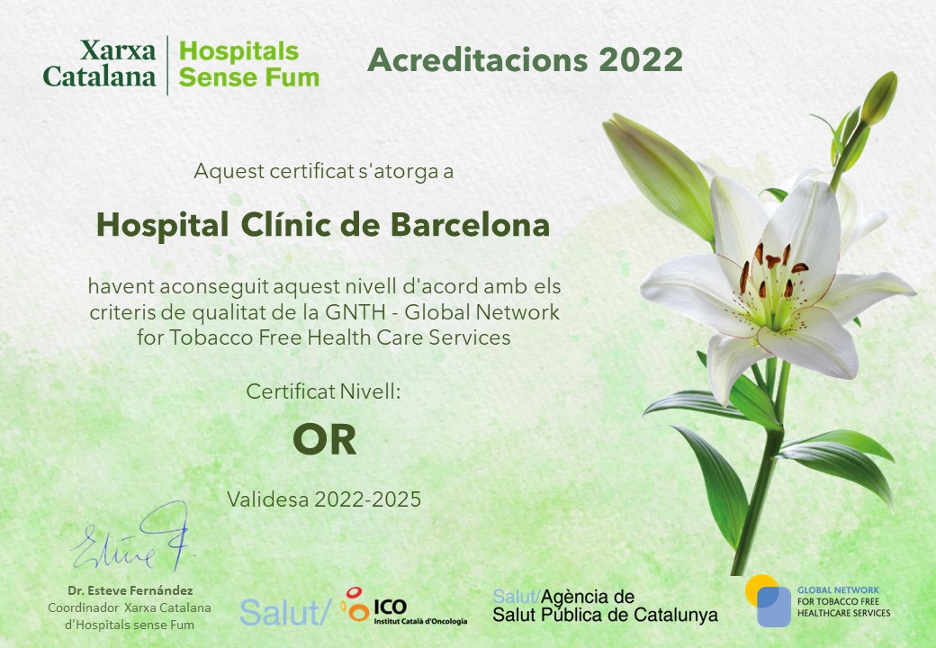 El projecte Hospital sense Fum al centre va començar l’any 2003. La primera enquesta de consum de tabac (2004) entre els treballadors del centre va detectar un 35,2% de fumadors. Amb els pas dels anys i la implementació de diverses activitats de control de tabaquisme, aquesta xifra va anar baixant progressivament fins l’any2007 que va resultar en un 27,4%. Els indicadors de qualitat del projecte acreditats el 2011 mostren el màxim nivell al que es pot arribar al Qüestionari Selfaudit (149/168). L’Hospital Clínic compta amb personal format en tabaquisme i una Unitat de Deshabituació Tabàquica ha ajudat a deixar de fumar a més de 180 treballadors i 400 pacients ingressats.